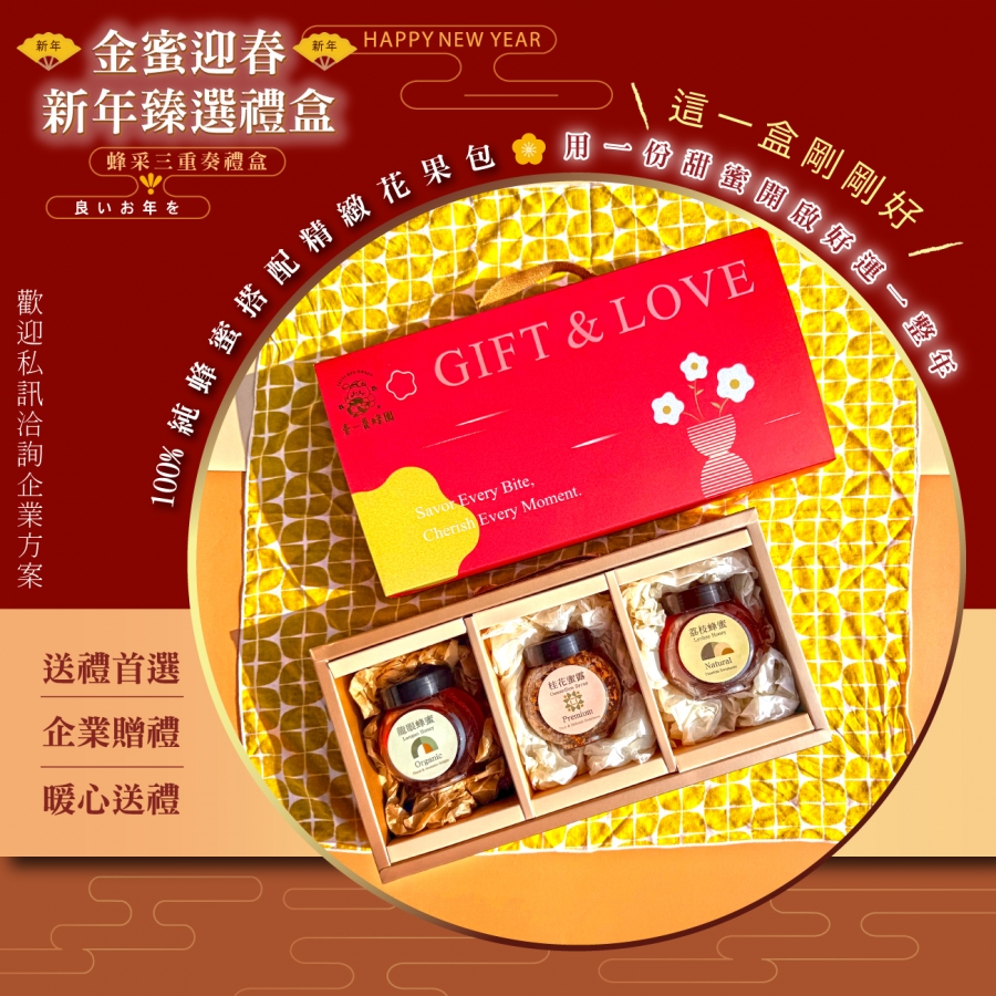 蜂采三重奏禮盒(龍眼蜜+荔枝蜜+桂花蜜露)-新年款(金蜜迎春・新年臻選禮盒) |