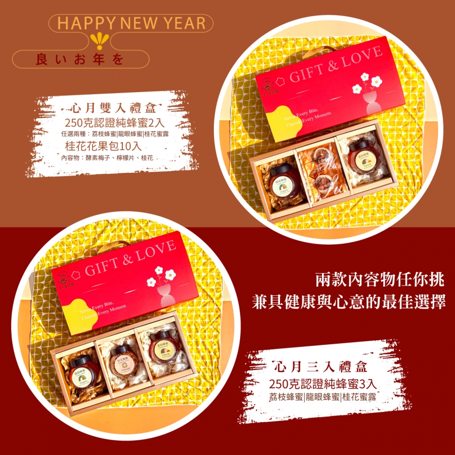 心月雙蜜禮盒(龍眼蜜+荔枝蜜+花果包)-新年款(金蜜迎春・新年臻選禮盒) |